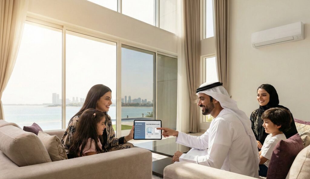 Current UAE suppliers including Smart Glass Masters and Glass Labs report installations averaging AED 3,200 per square meter for electrochromic panels—roughly eight times the cost of conventional low-E glass. The thermal performance justifies this premium in specific applications. A 2024 monitoring study of a Jumeirah villa with 85 square meters of south-facing electrochromic glass documented 34% reduction in afternoon cooling load compared to an identical north-facing elevation using standard glazing.